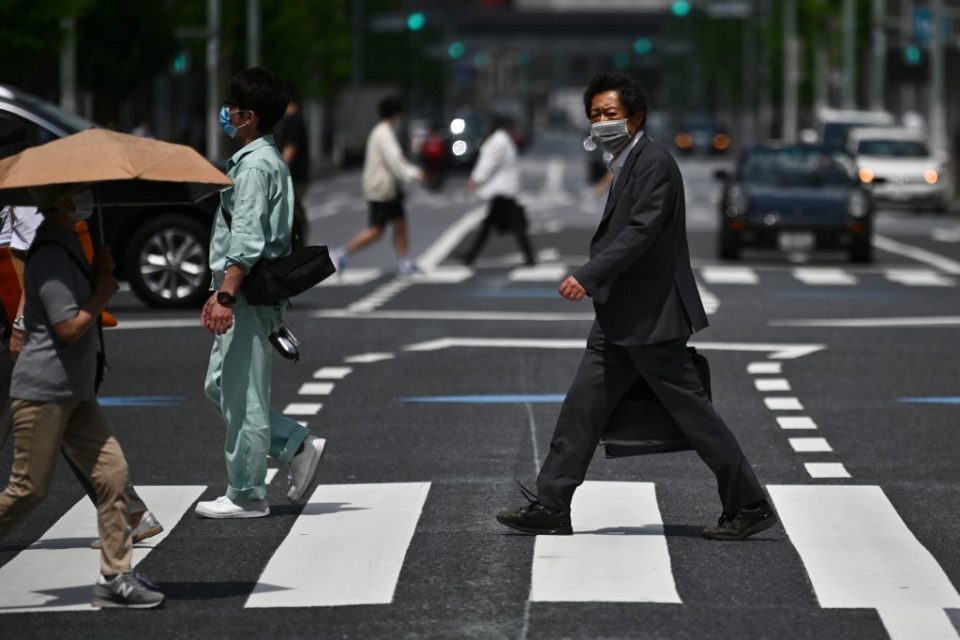 People wearing face masks amid the COVID-19 coronavirus outbreak walk across a street in Tokyo on May 13, 2020. (Photo by Charly TRIBALLEAU / AFP)