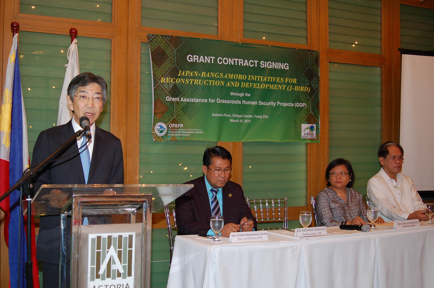 Japanese Ambassador Kazuhide Ishikawa has signed 6 grant contracts with respective recipient organizations for various social development projects in conflict – affected areas in Mindanao at 9:00 a.m. onMarch 24, 2015 at Astoria Plaza Hotel. These projects are funded through the Grant Assistance for Grassroots Human Security Projects (GGP) implemented by the Embassy of Japan as part of the Japan-Bangsamoro Initiatives for Reconstruction and Development (J-BIRD).