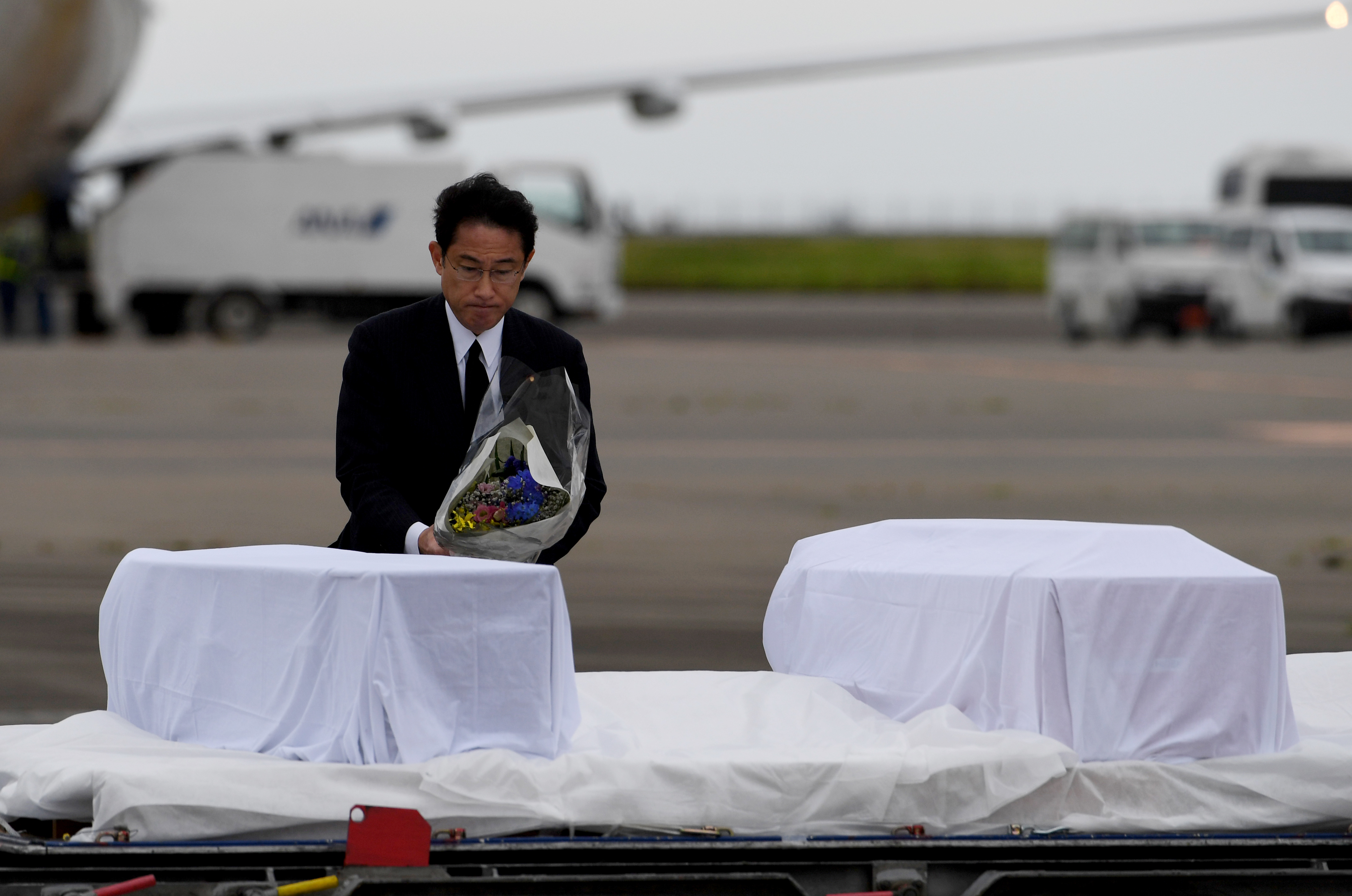 Kishida joined others to offer floral tributes and bowed deeply as they held a moment of silence before the coffins.