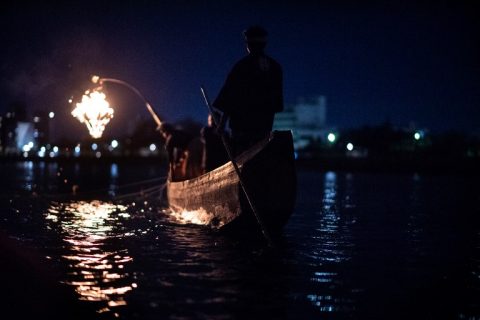 The job requires a tolerance for unusual hours — fishing takes place after sundown, with the usho using flaming lamps hung on their boats to attract fish below the surface.