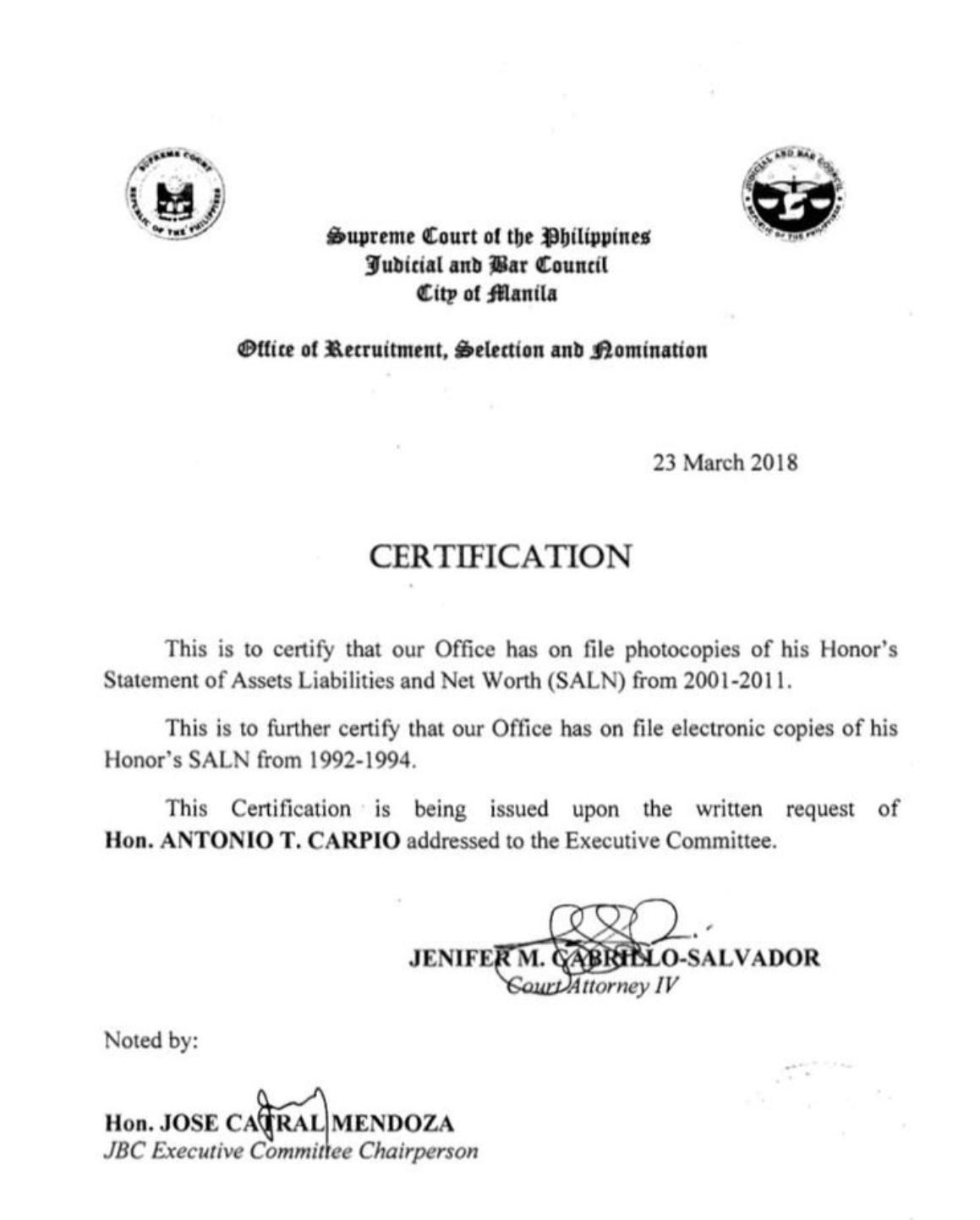 “This is to certify that our Office has on file photocopies of his Honor’s Statement of Assets Liabilities and Net Worth (SALN) from 2001 – 2011,” stated the JBC certification signed by Court Attorney IV Jennifer Cabrillo-Salvador.