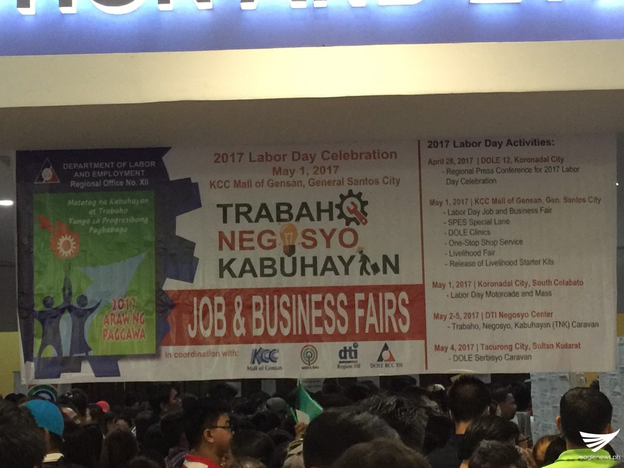 GENERAL SANTOS CITY, Cotabato South (Eagle News) – Dinagsa ng humigit kumulang 1,000 job seekers ang isinagawang job fair sa KCC Convention Center, General Santos City nitong Lunes, May 1. Inihanda ito ng Department of Labor and Employment (DOLE) sa iba’t ibang lugar sa ating bansa. Ito ay bilang paggunita sa unang Labor Day sa ilalim ng administrasyon ni Pangulong Rodrigo Duterte.