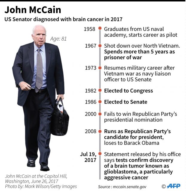 WASHINGTON, United States (AFP) — John McCain, a war hero and towering figure in American politics, known for reaching across the aisle in an increasingly divided nation, died Saturday following a battle with brain cancer. He was 81.