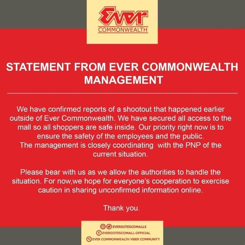 A statement from Ever Gotesco assured the public that there were no civilians injured in the incident, which it said was a shootout that happened outside the mall.