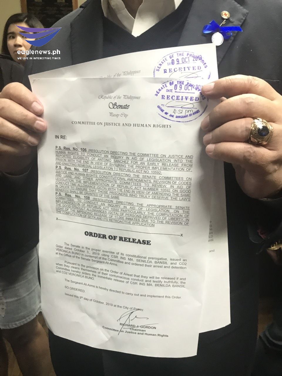 “Pursuant to the provision on the order of arrest that they will be released if and when they cleanse themselves of the contumacious conduct and testify truthfully, the committee hereby orders (their) immediate release,” the order signed by committee on justice and human rights chair Richard Gordon said.