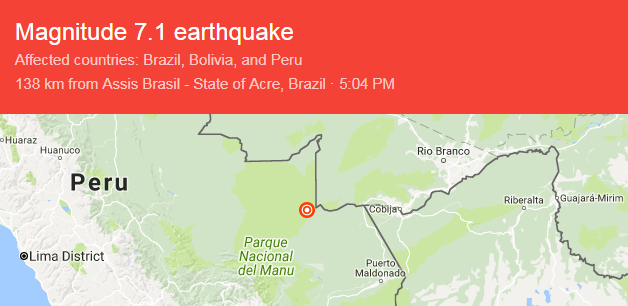 It said the quake hit at a depth of 609 kilometers (380 miles), on Peru’s eastern frontier with Brazil.