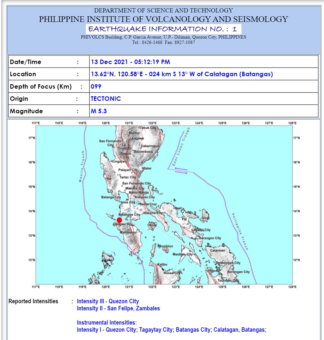 (Eagle News) – A magnitude 5.3 quake struck Batangas at 5:12 p.m. Monday, December 13, which was also felt in surrounding areas, the Philippine Institute of Volcanology and Seismology (PHIVOLCS) said.