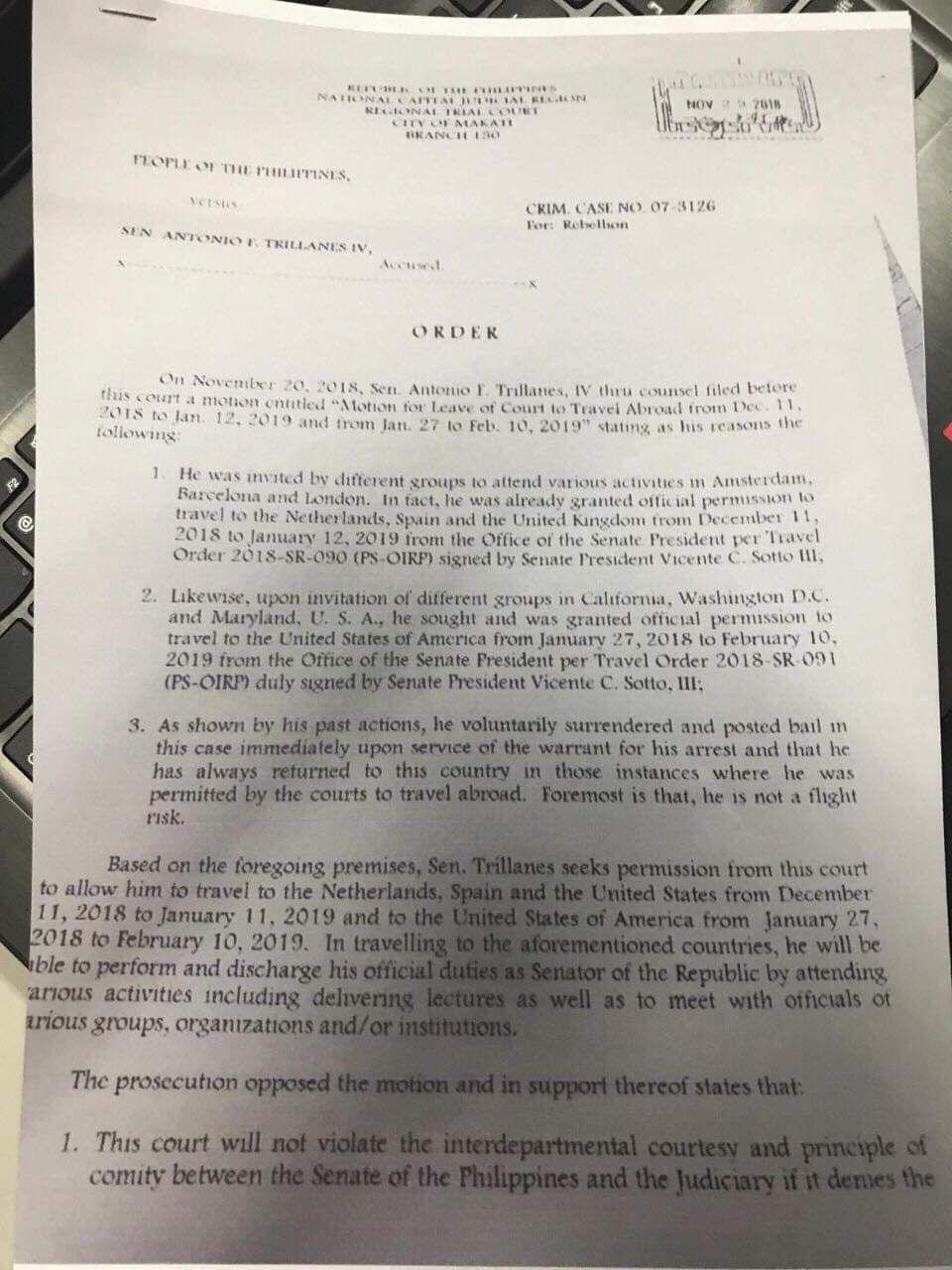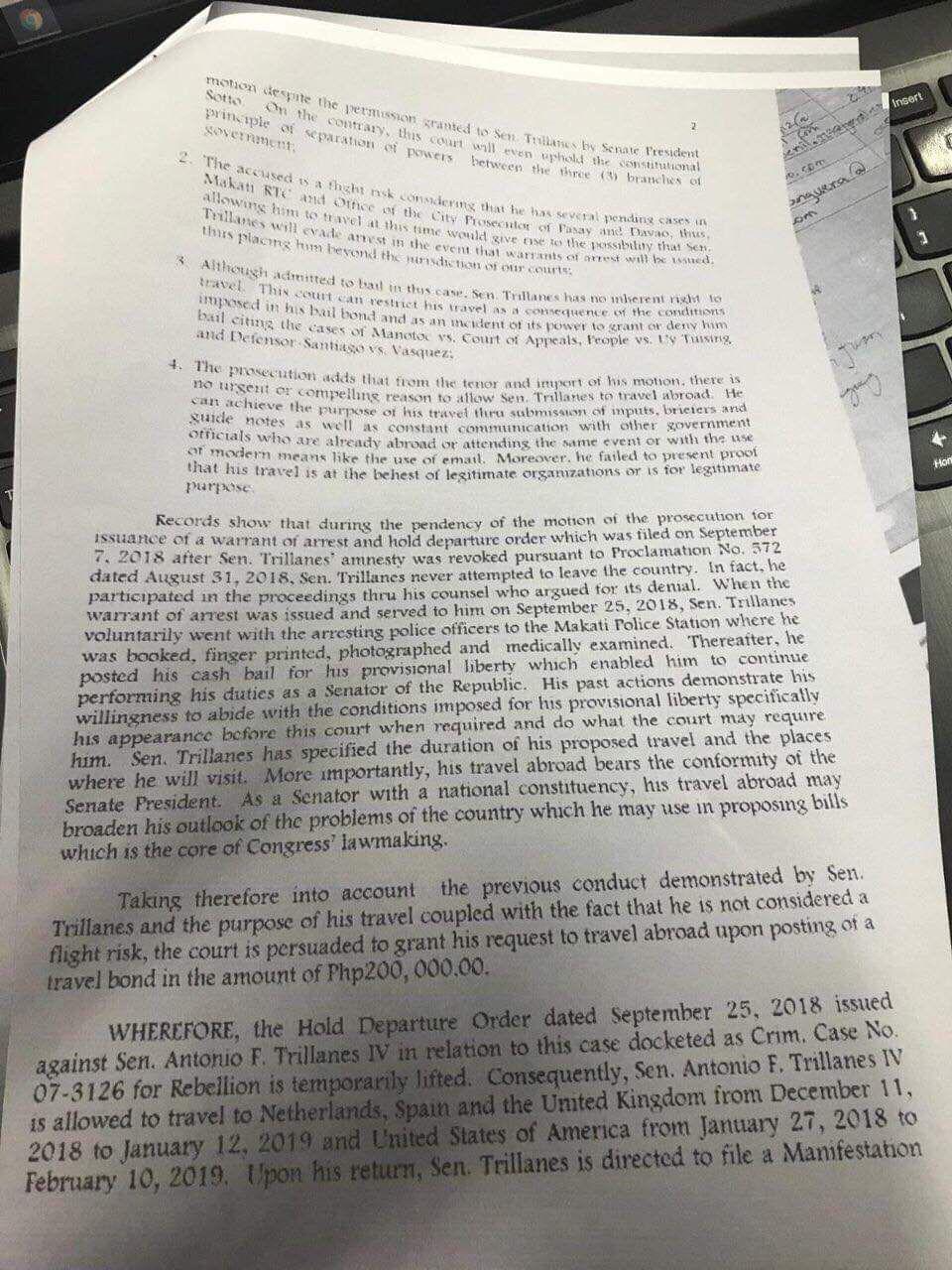 In allowing Trillanes to travel to the Netherlands, Spain and the United Kingdom from December 11, 2018 to January 12, 2019, and to the United States from January 27, 2018 to February 10, 2019, Judge Elmo Alameda of the Makati Regional Trial Court Branch 150 noted the senator’s past actions that “demonstrate his willingness to abide with the conditions imposed for his provisional liberty..”