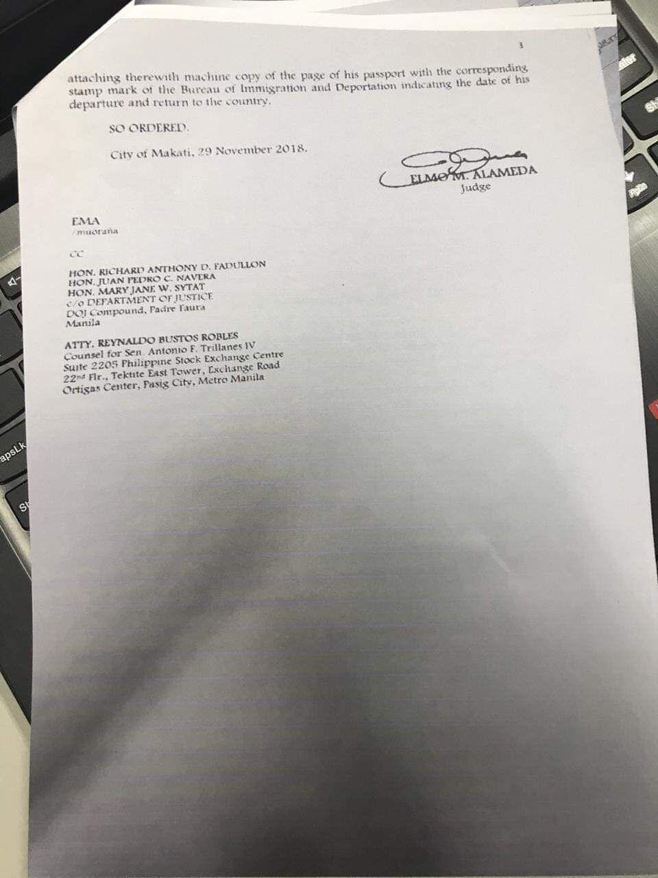 Alameda required Trillanes to post a P200,000 travel bond, and ordered the hold departure order issued against Trillanes on Sept. 25 “temporarily lifted.”