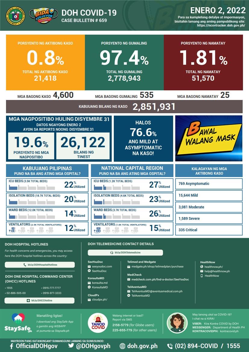 (Eagle News) — COVID-19 cases in the Philippines rose to 2,851,931 after the Department of Health reported 4,600 additional cases on Sunday, Jan. 2.
