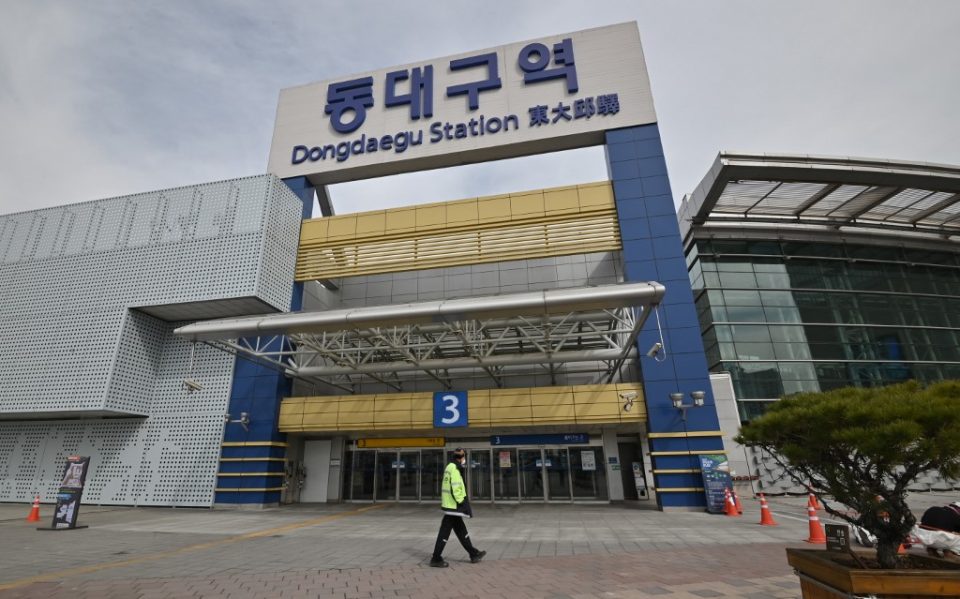 A man wearing a face mask walks in front of Dongdaegu railway station in the southeastern city of Daegu on February 24, 2020. – South Korea reported 161 more coronavirus cases on February 24, taking the nationwide total to 763 and making it the world’s largest total outside China. The country has seen a rapid surge in the number of coronavirus cases — adding more than 700 cases in less than a week — since a cluster of infections emerged from a religious sect in the southern city of Daegu. (Photo by Jung Yeon-je / AFP)