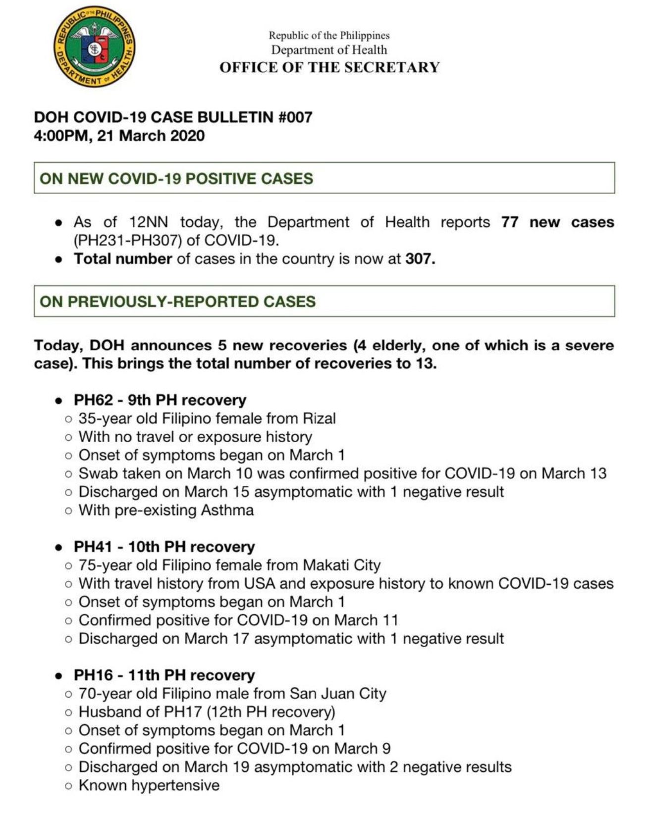 (Eagle News) – The country’s total confirmed coronavirus cases had risen to 307, with the addition of 77 new cases, the Department of Health (DOH) announced on Saturday, March 21.