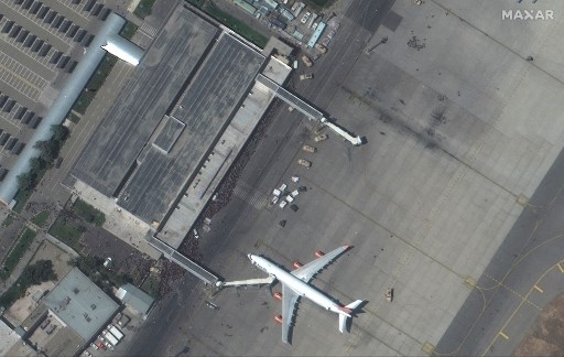 This handout satellite image released by Maxar Technologies shows crowds of people at the terminal, during the chaotic scene underway at Kabul’s Hamid Karzai International Airport in Afghanistan as thousands of people converged on the tarmac and airport runways as countries attempt to evacuate personnel from the city on August 16, 2021. – All military and civilian flights have been halted at the Kabul airport because of the crowds of civilians who have surged out onto the runways, Pentagon spokesman John Kirby said on August 16, 2021. “US military forces are on the scene working alongside Turkish and other international troops to clear the area of people. We do not know how long this will take,” Kirby said. (Photo by – / Satellite image ©2021 Maxar Technologies / AFP)