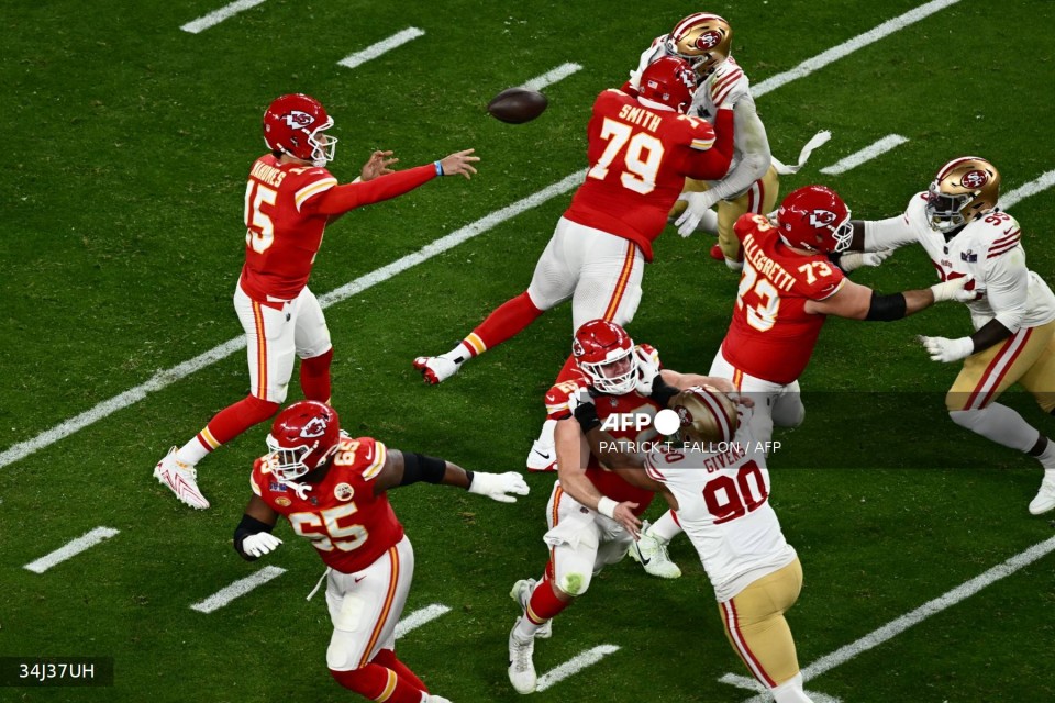 Kansas City Chiefs’ quarterback #15 Patrick Mahomes passes the ball during Super Bowl LVIII between the Kansas City Chiefs and the San Francisco 49ers at Allegiant Stadium in Las Vegas, Nevada, February 11, 2024. (Photo by Patrick T. Fallon / AFP)