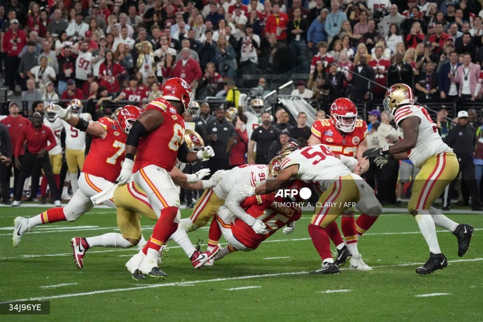 Kansas City Chiefs’ quarterback #15 Patrick Mahomes is tackled during Super Bowl LVIII between the Kansas City Chiefs and the San Francisco 49ers at Allegiant Stadium in Las Vegas, Nevada, February 11, 2024. (Photo by TIMOTHY A. CLARY / AFP)
