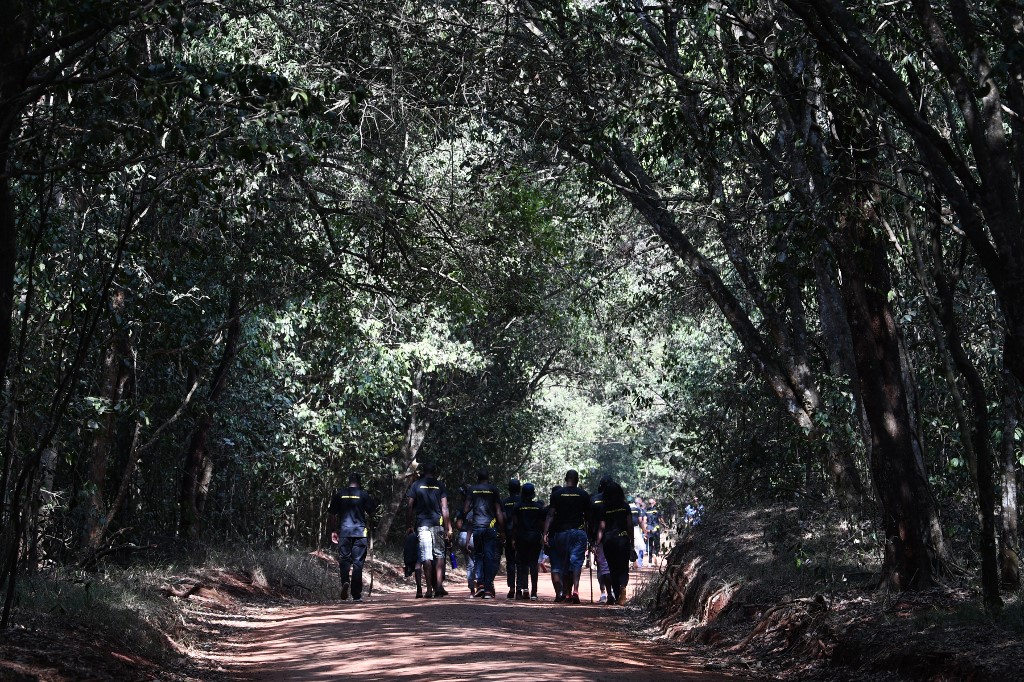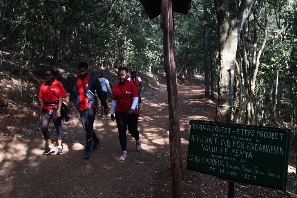 A group of people walking in Karura forest, Nairobi on September 17, 2019. – In the space of ten years, Karura forest has gone from a dangerous no-man’s land to one of the safest and most popular destinations in Nairobi, a refuge in a city that has long carried the unfortunate moniker “Nairobbery”. (Photo by SIMON MAINA / AFP)