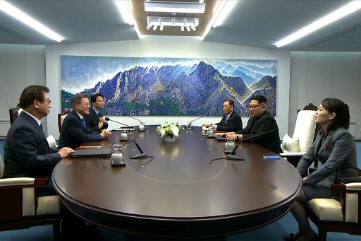 The two men briefly stepped back over the line into the North before walking to the Peace House building on the southern side of the truce village of Panmunjom for the summit — only the third of its kind since hostilities ceased in 1953. / AFP/