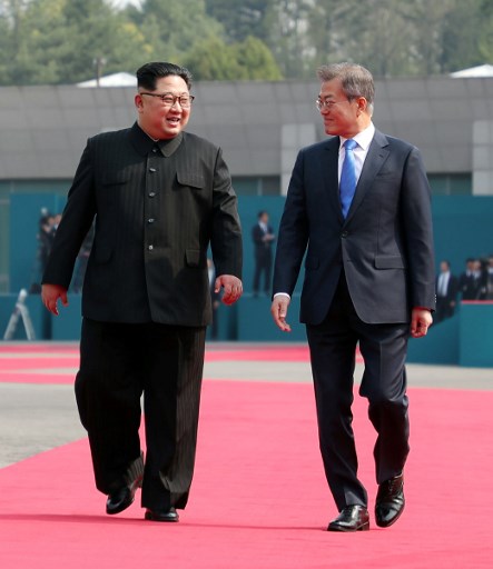 The two men briefly stepped back over the line into the North before walking to the Peace House building on the southern side of the truce village of Panmunjom for the summit — only the third of its kind since hostilities ceased in 1953. / AFP PHOTO / Korea Summit Press Pool / Korea Summit Press Pool