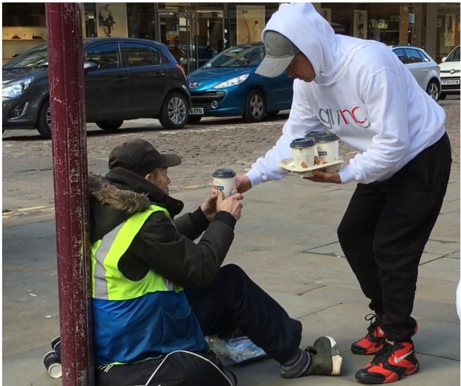 Kindness makes a difference: INC members give a cup of coffee and a helping hand to the homeless in Manchester, UK