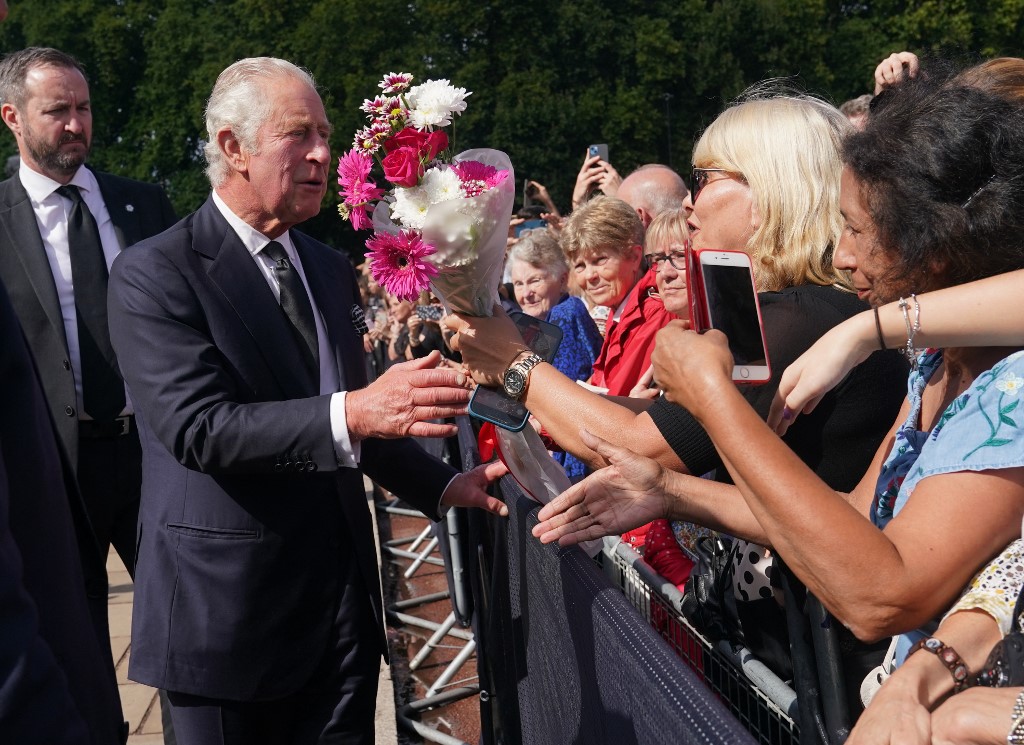 Crowds have massed outside Buckingham Palace both to mourn the queen and to wish Charles well, some of them shouting “God Save the King” as he greeted them on his return from Scotland on Friday.