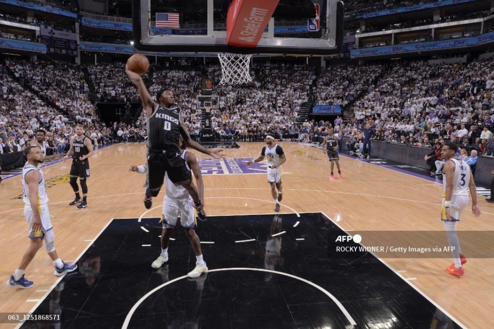 Fox made 13-of-27 shots in his playoff debut, 4-of-8 from 3-point range, and 8-of-12 free throws then after the victory pushed the button to send the Kings’ laser light — symbolic of a Kings victory — from the outside of the arena.