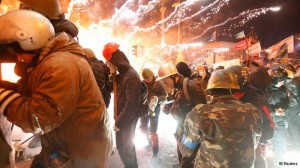 A ribbon of fire burned throughout the night in Independence Square, , also known as the Maidan, as protesters – some armed with clubs and wearing body armor – stood their ground. Tents and tyres were set alight to form a burning barricade across the square that separated police and protesters.