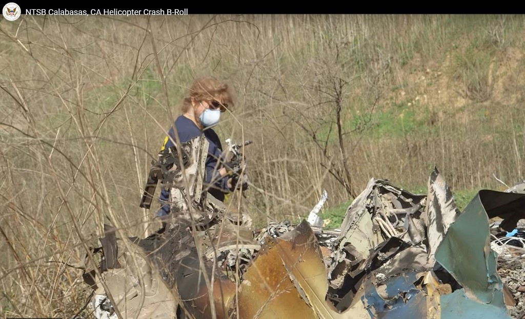 Images showed investigators earlier flying drones over the accident site and manually combing through twisted, charred wreckage of the helicopter, which was scattered over a wide area of 600 feet (180 meters).