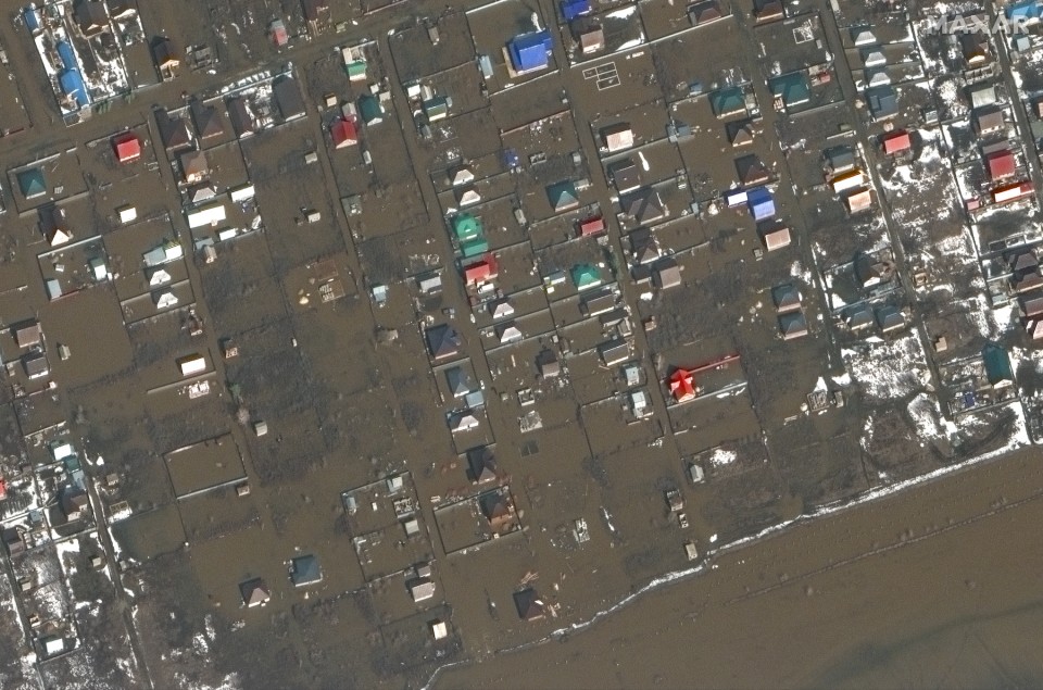 This handout satellite image released by Maxar Technologies on April 10, 2024 shows floodwaters around homes near Orenburg airbase on April 3, 2024. – Water levels in overflowing rivers were still rising on April 9 in swathes of Russia and Kazakhstan that have been hit by massive floods, with Russia’s city of Orenburg and western Siberia bracing for a new peak. (Photo by Handout / Satellite image ©2024 Maxar Technologies / AFP)
