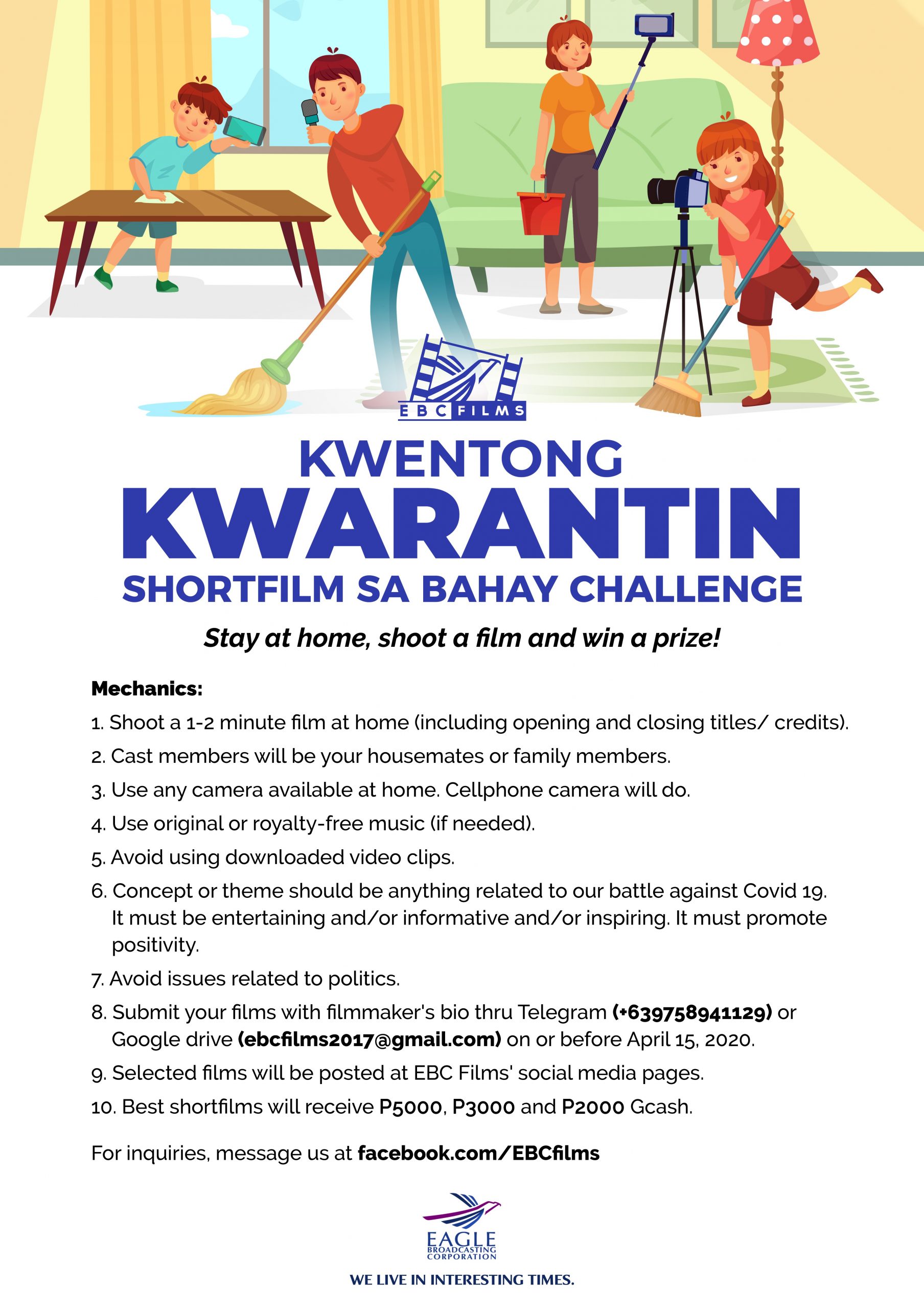 EBC Films is inviting you to “Kwentong Kwarantin” by creating a short-film that can tell ways on how to fight COVID-19 through film. All the while, informing, inspiring and entertaining those stuck at home.