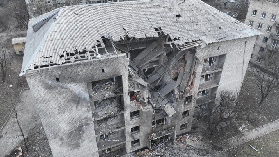This handout picture taken and released by Ukrainian Emergency Service on February 21, 2024 shows a damaged building, where four residents were wounded, after night attack to Pokrovsk district, Donetsk region, amid Russian invasion in Ukraine. – Russian bombing raids killed three people including a child late on February 21, 2024 near Ukraine’s eastern city of Donetsk, local authorities said. The strikes hit nine apartment blocks and a hospital in Selydove, about 20 kilometres (12 miles) west of the front line, the local council said on Telegram. (Photo by Handout / UKRAINIAN EMERGENCY SERVICE / AFP)