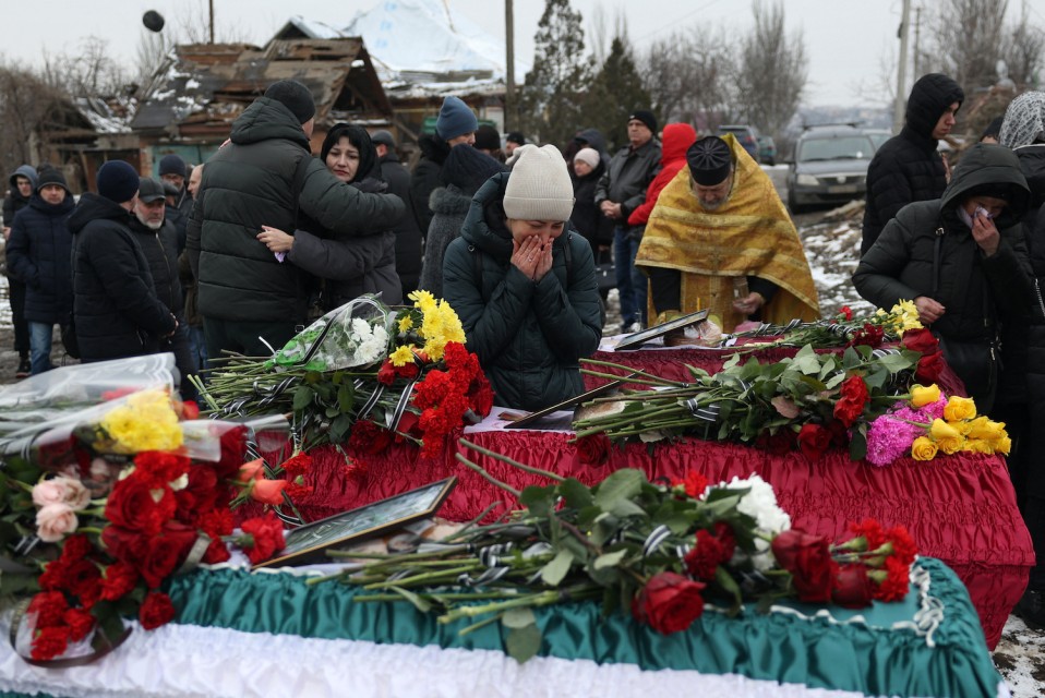 Relatives and friends attend a funeral ceremony for Valentyna Leonicheva, 74, Lyudmyla Kravchenko, 46, Sergiy Kravchenko, 23, at the site of their home, destroyed by a Russian missile strike, in Kramatorsk, Donetsk region, on February 22, 2024, amid the Russian invasion of Ukraine. (Photo by Anatolii STEPANOV / AFP)