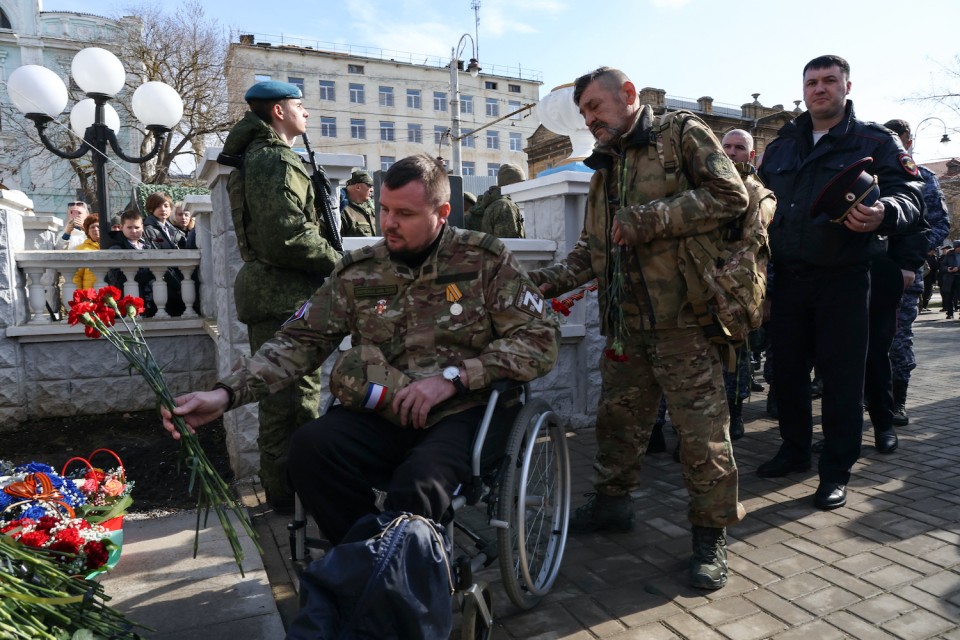 Attendees, including relatives of fallen participants in the Russian military action in Ukraine, take part in the opening ceremony of the obelisk in honor of the fallen heroes of the so-called “special military operation” in Ukraine, in the center of Yevpatoria, Crimea, on February 22, 2024. (Photo by STRINGER / AFP)