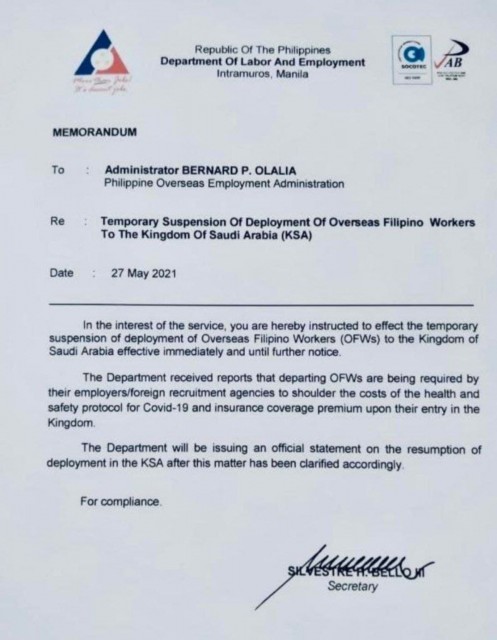 “In the interest of service, you are hereby instructed to affect the temporary suspension of deployment of OFWs to the Kingdom of Saudi Arabia effective immediately until further notice,” Bello said in the memo.