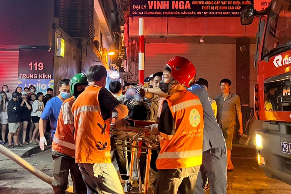 TOPSHOT – Fire and Rescue workers carry a victim to an ambulance following a big fire at an apartment block in Hanoi on May 24, 2024. A fire that ripped through a small apartment block in central Hanoi has killed at least 14 people and injured three others, state media said May 24. (Photo by Linh Dan / AFP)