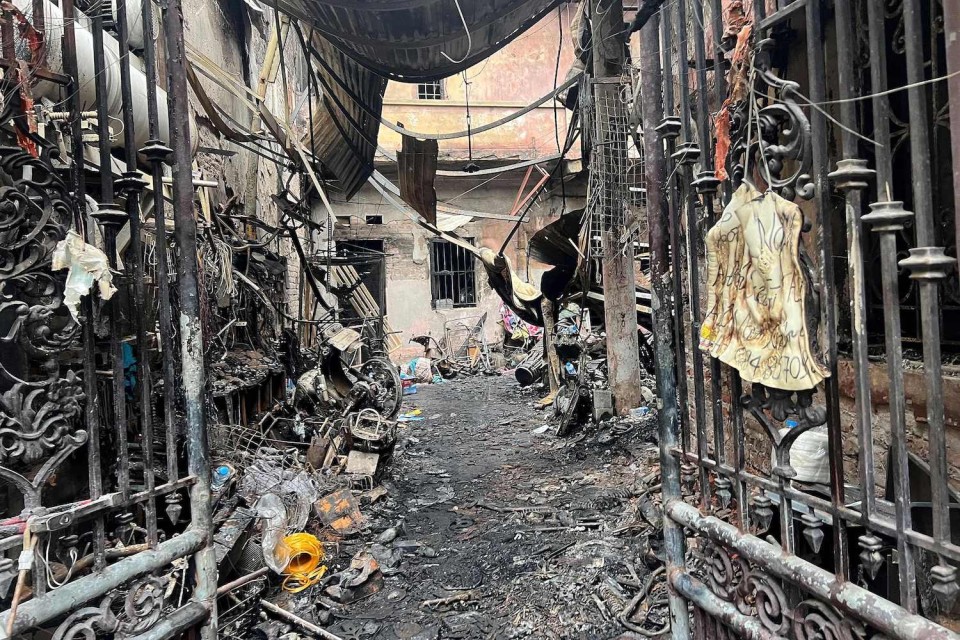 A charred entrance gate is pictured following a big fire at an apartment block in Hanoi on May 24, 2024. A fire that ripped through a small apartment block in central Hanoi has killed at least 14 people and injured three others, state media said May 24. (Photo by Kien Pham / AFP)