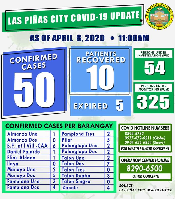 The local government said of the 50 as of Wednesday, April 8, one each was from Almanza Uno, Barangay Daniel Fajardo, and Barangay Elias Aldana; two each from Manuyo Uno, Pamplona Tres, Pulanglupa Uno, Pulanglupa Dos, and Talon Uno; three each from Talon Kuwatro and Pamplona Uno; four each from Pamplona Dos and Zapote; five each from Manuyo Dos and Pilar; six from BF International Village-CAA; and seven from Talon 2.