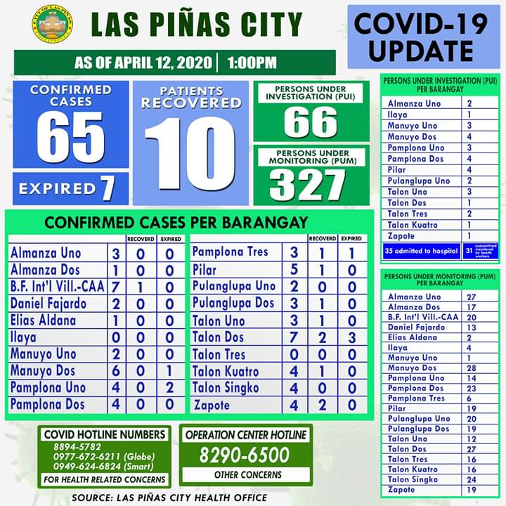 The local government said of the 65, one each was from Barangay Elias Aldana and Almanza Dos, two each from Barangay Daniel Fajardo, Manuyo Uno and Pulanglupa Uno; three each from Almanza Uno,.Pamplona Tres, Pulanglupa Dos and Talon Uno; four each from Pamplona Uno, Pamplona Dos, Talon Kuatro, Talon Singko and Zapote; five from Pilar; six from Manuyo Dos; and seven from Talon Dos and BF International Village-CAA.
