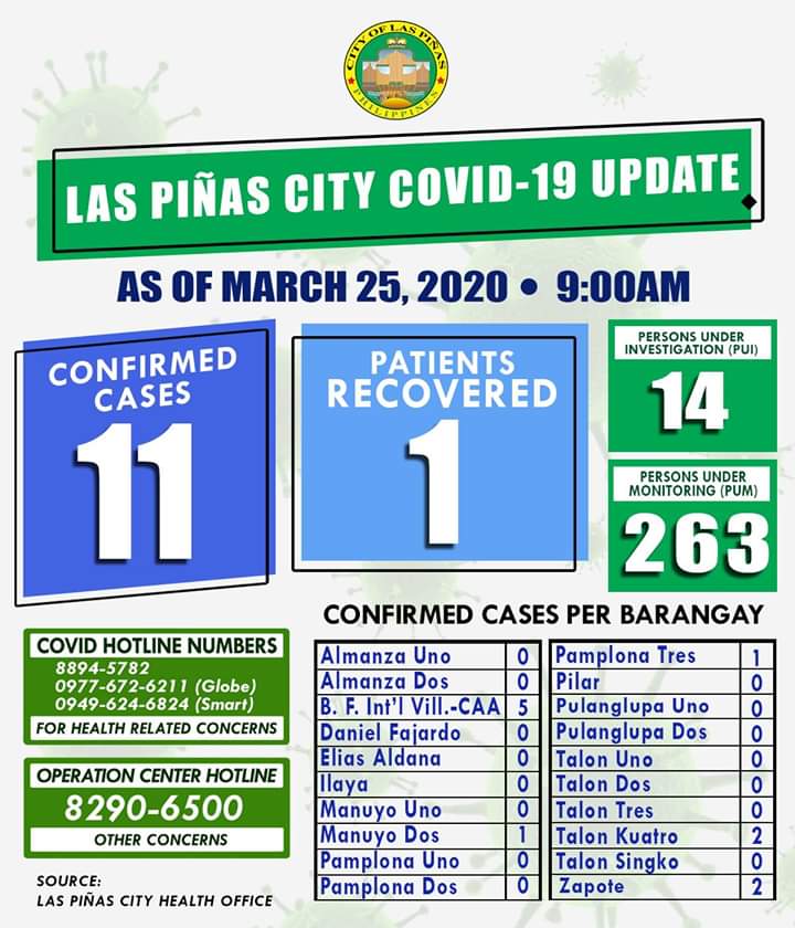 (Eagle News)–The Las Piñas government on Wednesday, March 25, confirmed four more cases of the coronavirus disease 2019, bringing the total to 11.
