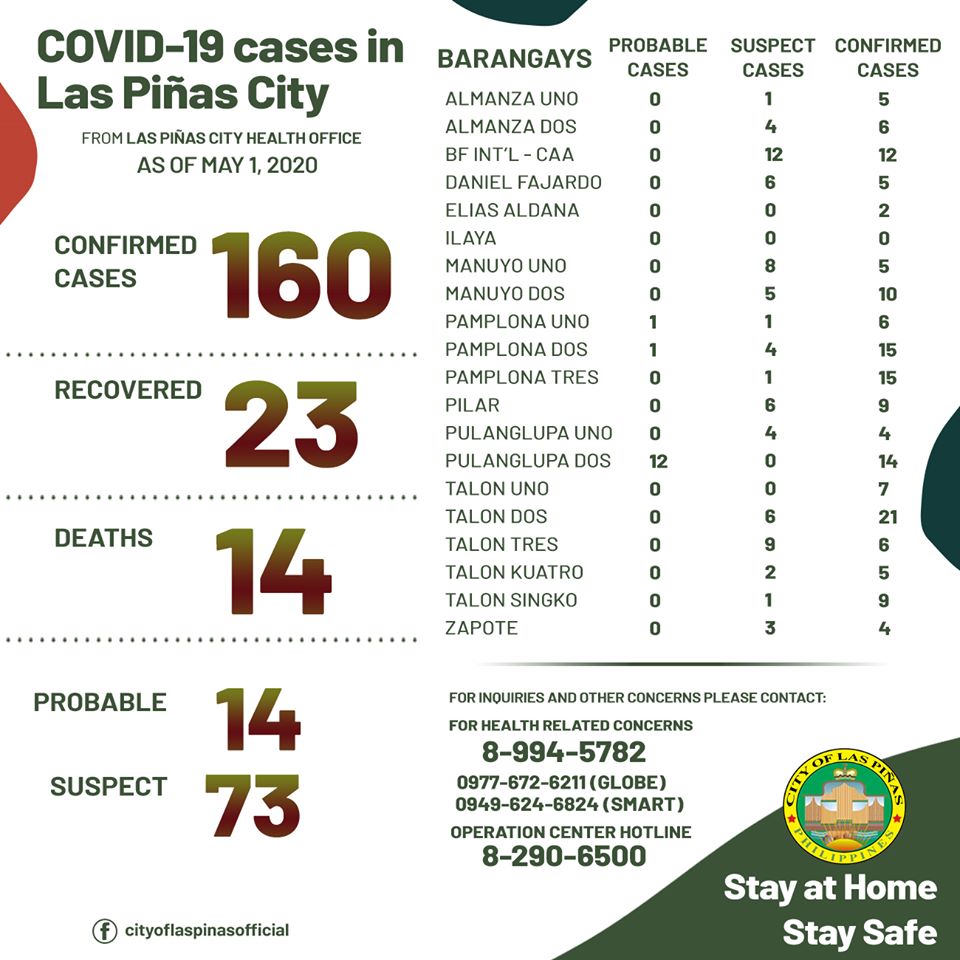 (Eagle News) — The Las Piñas government on Friday, May 1, reported eleven additional COVID-19 cases in the city, bringing the total to 160.