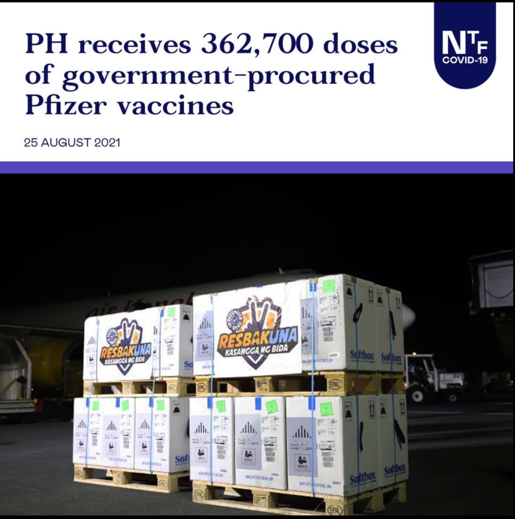 (Eagle News) – Some 362,700 doses of Pfizer vaccines were delivered on Wednesday night, Aug. 26, bringing to almost 5 million the total number of Pfizer doses in the country.