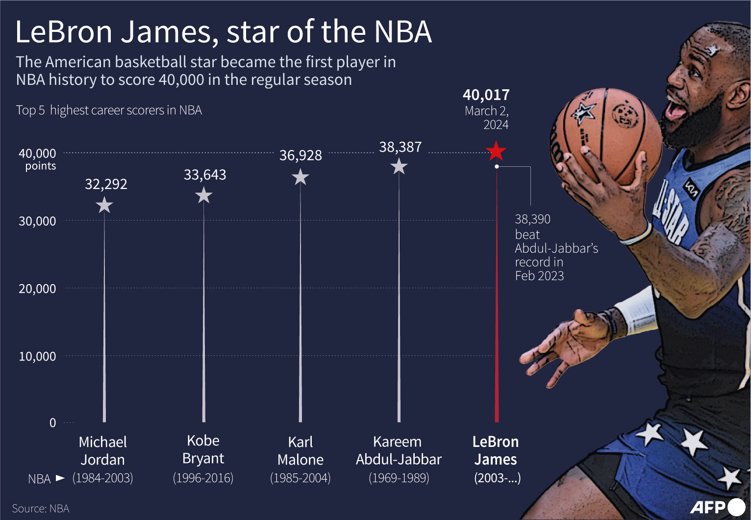 LOS ANGELES, March 3, 2024 (AFP) – LeBron James became the first NBA player to reach 40,000 career regular-season points on Saturday, the 39-year-old superstar scoring nine against defending champion Denver to achieve the milestone.