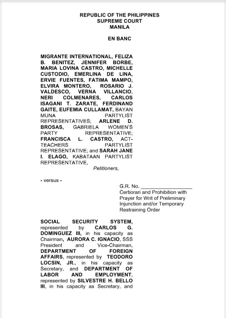 In their 35-page petition for certiorari and prohibition, Migrante International; former Bayan Muna Rep. Neri Colmenares; Bayan Muna Reps. Carlos Zarate, Ferdinand Gaite and Eufemia Cullamat; Alliance of Concerned Teachers Rep. France Castro; Gabriela Women’s Party Rep. Arlene Brosas; Kabataan Rep. Sarah Elago; and OFWs Feliza Benitez, Jennifer Borbe, Maria Lovina Castro, Michelle Custodio, Emerlina de Lina, Ervie Fuentes, Fatima Mampo, Elvira Montero, Rosario Valdesco and Verna Villancio particularly asked the SC to nullify several provisions of the Social Security Act and its implementing rules and regulations that posit their mandatory contributions which should reportedly start before they leave the country.