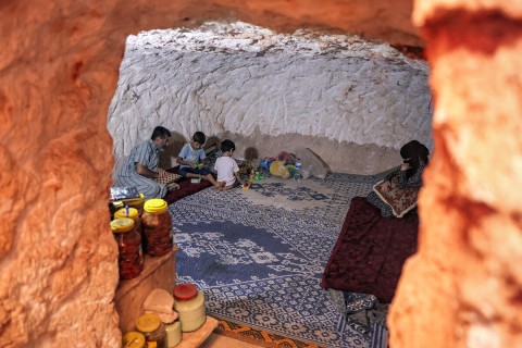 Mostly bereft of furniture, the shelter is covered with basic floor mats. Jars of vine leaves and other fermented vegetables are stored in the cool of the underground cave.