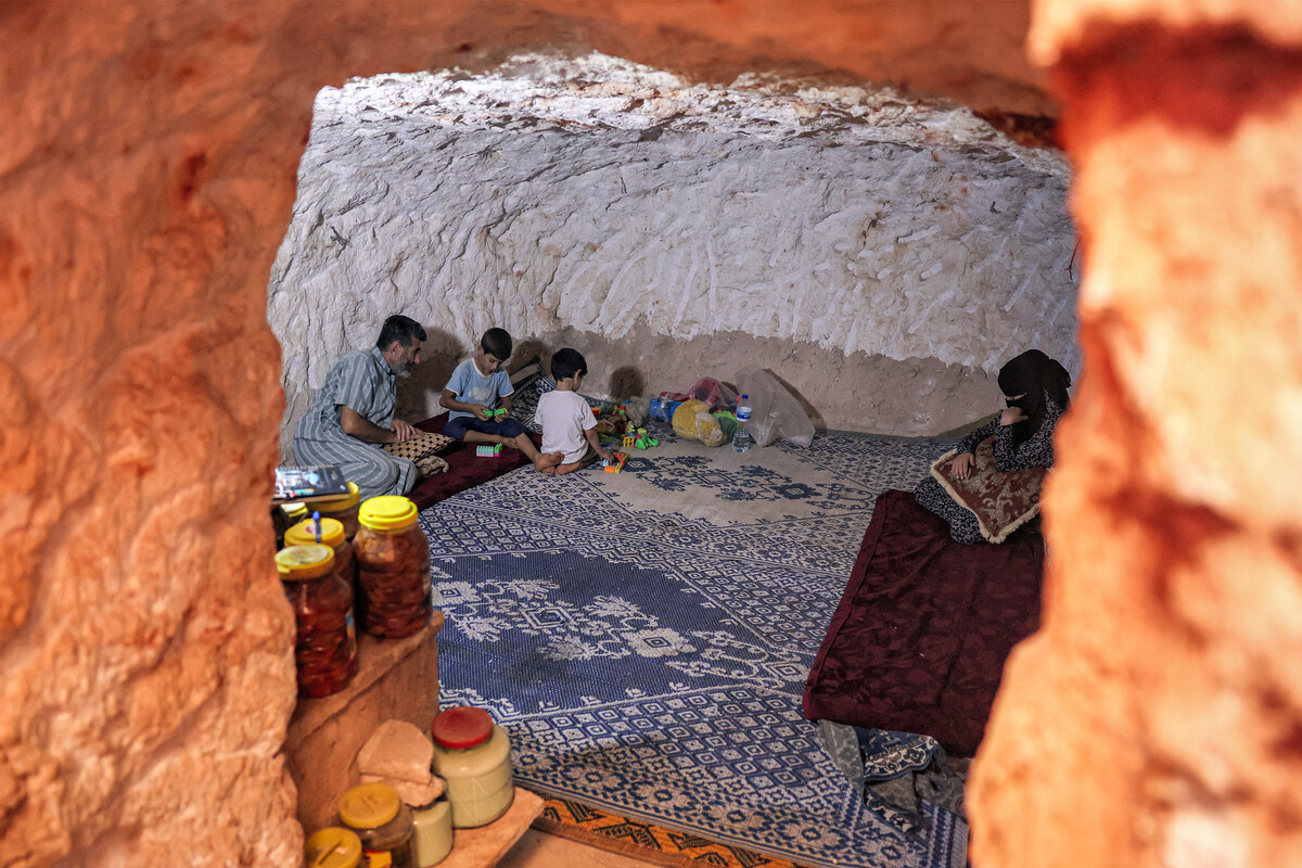 In a battered village in Syria’s last main opposition bastion, one resident has hewn a bomb shelter out of rock to stay on his land and protect his family from attacks.