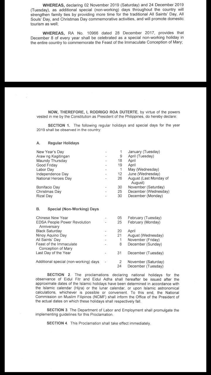 (Eagle News) — President Rodrigo Duterte has signed Proclamation No. 555, which lists down the regular holidays and special non-working holidays in 2019.
