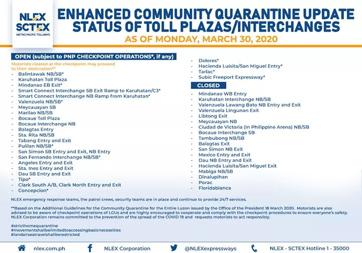 (Eagle News)–The North Luzon Expressway Corp. has released its list of toll plazas on NLEx and the Subic-Clark-Tarlac Expressway.