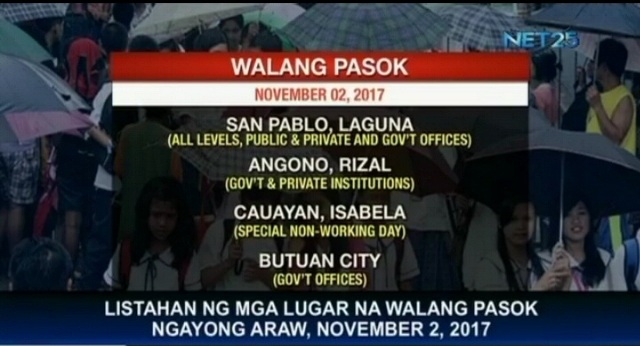 (Eagle News) – Nadagdagan pa ang mga lugar na nagdeklara ng suspensyon ng klase at pasok sa tanggapan ng lokal na gobyerno ngayong araw, November 2, 2017. Kabilang sa nagkansela ng klase at pasok sa trabaho ang mga bayan at lalawigan ng: