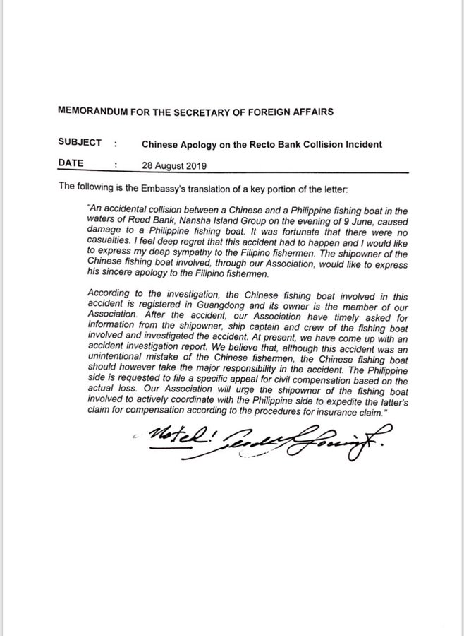 The apology was contained in a letter signed by Chen Shiqin, president of the Guangdong Fishery Mutual Insurance Association, portions of which were translated into English by the Philippine embassy in China.