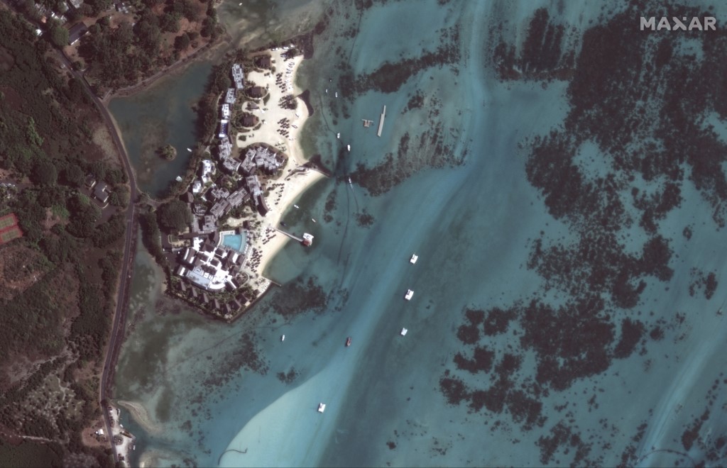 This August 12, 2020, handout satellite image obtained courtesy of Maxar Technologies shows the oil containment booms in place along the shoreline of Mauritius. – Salvage crews have successfully pumped all the fuel from the tanks of a giant cargo ship which ran aground off Mauritius, the prime minister said August 12, 2020, preventing another massive oil spill into the pristine waters. Further ecological disaster was averted as the MV Wakashio, a Japanese-owned bulk carrier, threatens to break apart at any moment after more than two weeks stranded on a coral reef off the island nation. (Photo by Handout / Satellite image ©2020 Maxar Technologies / AFP)