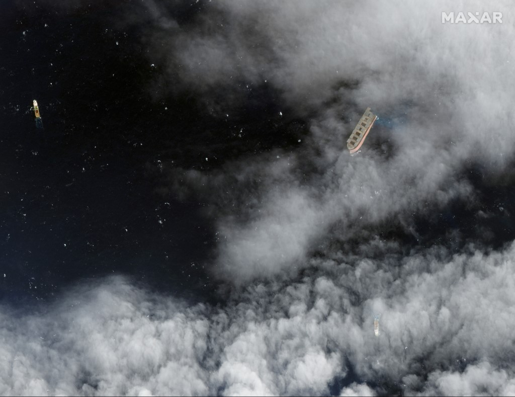 This August 19, 2020, handout satellite image obtained courtesy of Maxar Technologies shows an overview of the forward section of the MV Wahashio shipwreck and two tug boats off the coast of Mauritius. (Photo by Handout / Satellite image ©2020 Maxar Technologies / AFP)